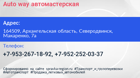 Auto way, автомастерская по адресу 164509, Архангельская область, Северодвинск, Макаренко, 7а в дальнейшем Организация, размещена в следующих категориях:
