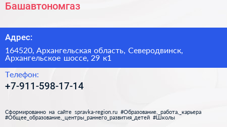 Башавтономгаз по адресу 164520, Архангельская область, Северодвинск, Архангельское шоссе, 29 к1 в дальнейшем Организация, размещена в следующих категориях: