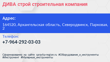 ДИВА строй, строительная компания по адресу 164520, Архангельская область, Северодвинск, Парковая, 2 в дальнейшем Организация, размещена в следующих категориях: