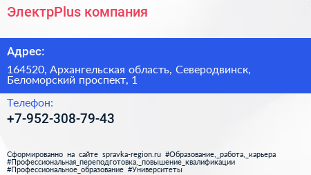 ЭлектрPlus, компания по адресу 164520, Архангельская область, Северодвинск, Беломорский проспект, 1 в дальнейшем Организация, размещена в следующих категориях: