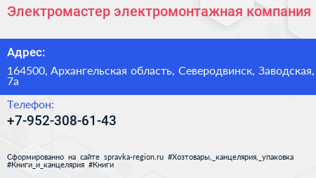Электромастер, электромонтажная компания по адресу 164500, Архангельская область, Северодвинск, Заводская, 7а в дальнейшем Организация, размещена в следующих категориях: