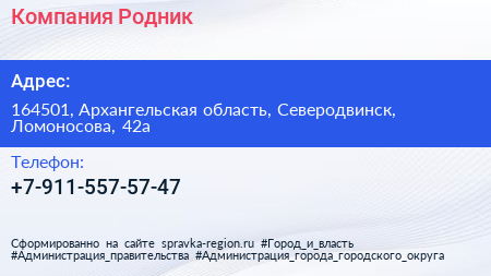 Компания Родник по адресу 164501, Архангельская область, Северодвинск, Ломоносова, 42а в дальнейшем Организация, размещена в следующих категориях:
