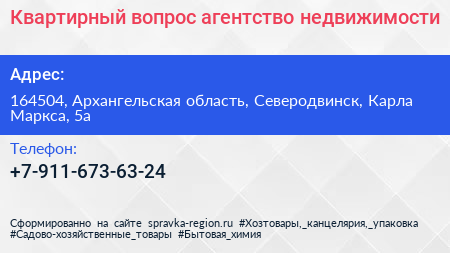 Квартирный вопрос, агентство недвижимости по адресу 164504, Архангельская область, Северодвинск, Карла Маркса, 5а в дальнейшем Организация, размещена в следующих категориях: