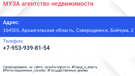 МУЗА, агентство недвижимости по адресу 164501, Архангельская область, Северодвинск, Бойчука, 2 в дальнейшем Организация, размещена в следующих категориях: