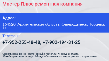Мастер Плюс, ремонтная компания по адресу 164520, Архангельская область, Северодвинск, Торцева, 1а в дальнейшем Организация, размещена в следующих категориях: