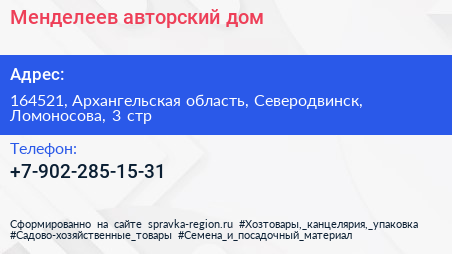 Менделеев, авторский дом по адресу 164521, Архангельская область, Северодвинск, Ломоносова, 3 стр в дальнейшем Организация, размещена в следующих категориях: