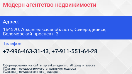 Модерн, агентство недвижимости по адресу 164520, Архангельская область, Северодвинск, Беломорский проспект, 3 в дальнейшем Организация, размещена в следующих категориях: