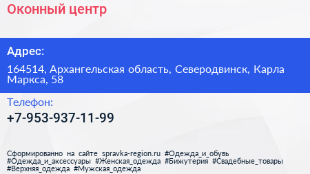 Оконный центр по адресу 164514, Архангельская область, Северодвинск, Карла Маркса, 58 в дальнейшем Организация, размещена в следующих категориях: