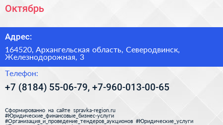 Октябрь по адресу 164520, Архангельская область, Северодвинск, Железнодорожная, 3 в дальнейшем Организация, размещена в следующих категориях: