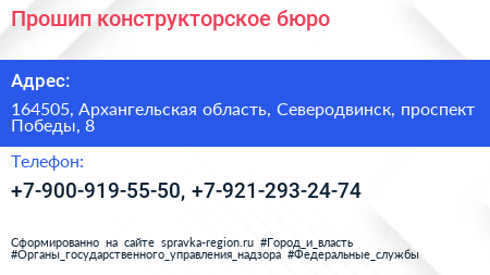 Прошип, конструкторское бюро по адресу 164505, Архангельская область, Северодвинск, проспект Победы, 8 в дальнейшем Организация, размещена в следующих категориях: