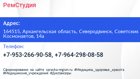 РемСтудия по адресу 164515, Архангельская область, Северодвинск, Советских Космонавтов, 14а в дальнейшем Организация, размещена в следующих категориях: