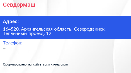 Севдормаш по адресу 164520, Архангельская область, Северодвинск, Тепличный проезд, 12 в дальнейшем Организация, размещена в следующих категориях:
