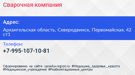 Сварочная компания по адресу Архангельская область, Северодвинск, Первомайская, 42 ст1 в дальнейшем Организация, размещена в следующих категориях: