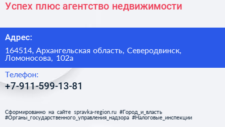 Успех плюс, агентство недвижимости по адресу 164514, Архангельская область, Северодвинск, Ломоносова, 102а в дальнейшем Организация, размещена в следующих категориях: