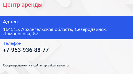 Центр аренды по адресу 164515, Архангельская область, Северодвинск, Ломоносова, 87 в дальнейшем Организация, размещена в следующих категориях: