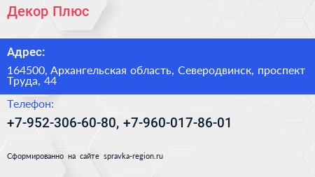 Декор Плюс по адресу 164500, Архангельская область, Северодвинск, проспект Труда, 44 в дальнейшем Организация, размещена в следующих категориях: