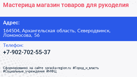 Мастерица, магазин товаров для рукоделия по адресу 164504, Архангельская область, Северодвинск, Ломоносова, 56 в дальнейшем Организация, размещена в следующих категориях: