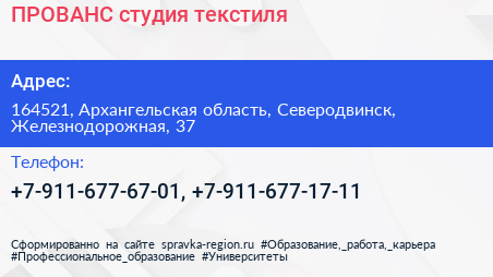 ПРОВАНС, студия текстиля по адресу 164521, Архангельская область, Северодвинск, Железнодорожная, 37 в дальнейшем Организация, размещена в следующих категориях: