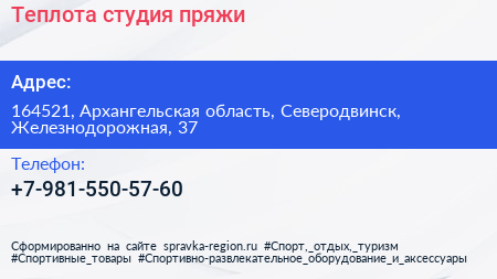 Теплота, студия пряжи по адресу 164521, Архангельская область, Северодвинск, Железнодорожная, 37 в дальнейшем Организация, размещена в следующих категориях:
