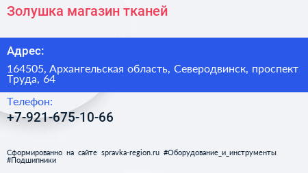 Золушка, магазин тканей по адресу 164505, Архангельская область, Северодвинск, проспект Труда, 64 в дальнейшем Организация, размещена в следующих категориях: