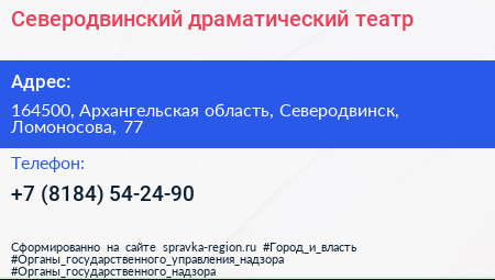 Северодвинский драматический театр по адресу 164500, Архангельская область, Северодвинск, Ломоносова, 77 в дальнейшем Организация, размещена в следующих категориях: