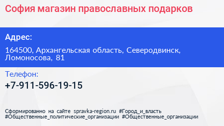 София, магазин православных подарков по адресу 164500, Архангельская область, Северодвинск, Ломоносова, 81 в дальнейшем Организация, размещена в следующих категориях: