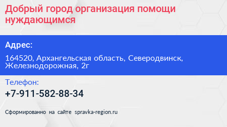 Добрый город, организация помощи нуждающимся по адресу 164520, Архангельская область, Северодвинск, Железнодорожная, 2г в дальнейшем Организация, размещена в следующих категориях: