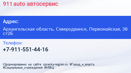 911 auto, автосервис по адресу Архангельская область, Северодвинск, Первомайская, 38 ст2Б в дальнейшем Организация, размещена в следующих категориях: