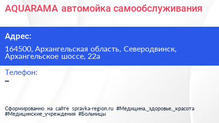 AQUARAMA, автомойка самообслуживания по адресу 164500, Архангельская область, Северодвинск, Архангельское шоссе, 22а в дальнейшем Организация, размещена в следующих категориях:
