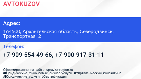 AVTOKUZOV по адресу 164500, Архангельская область, Северодвинск, Транспортная, 2 в дальнейшем Организация, размещена в следующих категориях:
