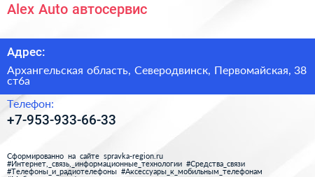 Alex Auto, автосервис по адресу Архангельская область, Северодвинск, Первомайская, 38 ст6а в дальнейшем Организация, размещена в следующих категориях:
