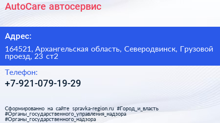 AutoCare, автосервис по адресу 164521, Архангельская область, Северодвинск, Грузовой проезд, 23 ст2 в дальнейшем Организация, размещена в следующих категориях: