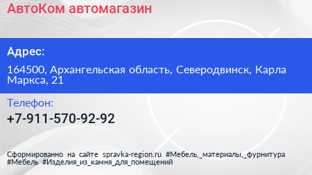 АвтоКом, автомагазин по адресу 164500, Архангельская область, Северодвинск, Карла Маркса, 21 в дальнейшем Организация, размещена в следующих категориях: