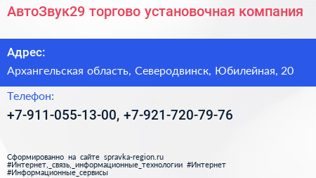 АвтоЗвук29, торгово-установочная компания по адресу Архангельская область, Северодвинск, Юбилейная, 20 в дальнейшем Организация, размещена в следующих категориях: