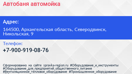 Автобаня, автомойка по адресу 164500, Архангельская область, Северодвинск, Никольская, 9 в дальнейшем Организация, размещена в следующих категориях: