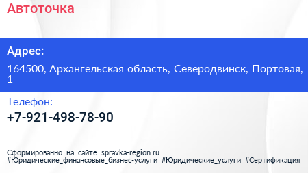Автоточка по адресу 164500, Архангельская область, Северодвинск, Портовая, 1 в дальнейшем Организация, размещена в следующих категориях: