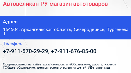 Автовеликан.PУ, магазин автотоваров по адресу 164504, Архангельская область, Северодвинск, Тургенева, 1 в дальнейшем Организация, размещена в следующих категориях: