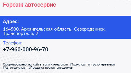 Fорсаж, автосервис по адресу 164500, Архангельская область, Северодвинск, Транспортная, 2 в дальнейшем Организация, размещена в следующих категориях: