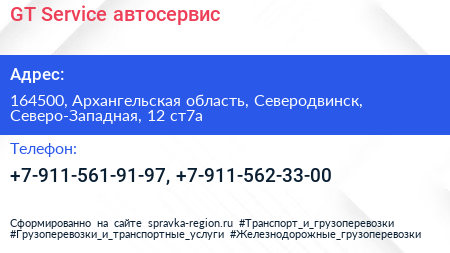 GT-Service, автосервис по адресу 164500, Архангельская область, Северодвинск, Северо-Западная, 12 ст7а в дальнейшем Организация, размещена в следующих категориях: