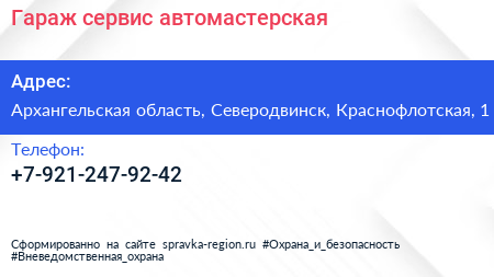 Гараж сервис, автомастерская по адресу Архангельская область, Северодвинск, Краснофлотская, 1 в дальнейшем Организация, размещена в следующих категориях: