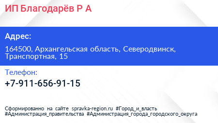 ИП Благодарёв Р.А. по адресу 164500, Архангельская область, Северодвинск, Транспортная, 15 в дальнейшем Организация, размещена в следующих категориях: