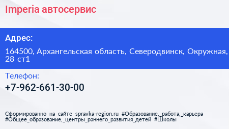 Imperia, автосервис по адресу 164500, Архангельская область, Северодвинск, Окружная, 28 ст1 в дальнейшем Организация, размещена в следующих категориях: