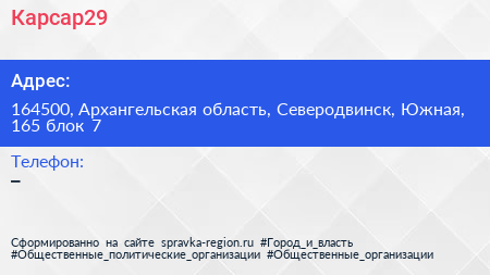 Карсар29 по адресу 164500, Архангельская область, Северодвинск, Южная, 165 блок 7 в дальнейшем Организация, размещена в следующих категориях: