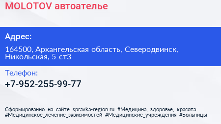 MOLOTOV, автоателье по адресу 164500, Архангельская область, Северодвинск, Никольская, 5 ст3 в дальнейшем Организация, размещена в следующих категориях: