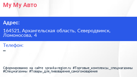 Му-Му Авто по адресу 164521, Архангельская область, Северодвинск, Ломоносова, 4 в дальнейшем Организация, размещена в следующих категориях: