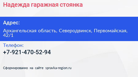 Надежда, гаражная стоянка по адресу Архангельская область, Северодвинск, Первомайская, 42/1 в дальнейшем Организация, размещена в следующих категориях: