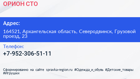 ОРИОН, СТО по адресу 164521, Архангельская область, Северодвинск, Грузовой проезд, 23 в дальнейшем Организация, размещена в следующих категориях: