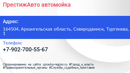 ПрестижАвто, автомойка по адресу 164504, Архангельская область, Северодвинск, Тургенева, 1 в дальнейшем Организация, размещена в следующих категориях: