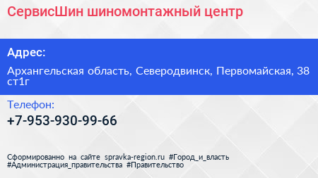 СервисШин, шиномонтажный центр по адресу Архангельская область, Северодвинск, Первомайская, 38 ст1г в дальнейшем Организация, размещена в следующих категориях: