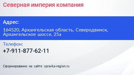 Северная империя, компания по адресу 164520, Архангельская область, Северодвинск, Архангельское шоссе, 25а в дальнейшем Организация, размещена в следующих категориях: